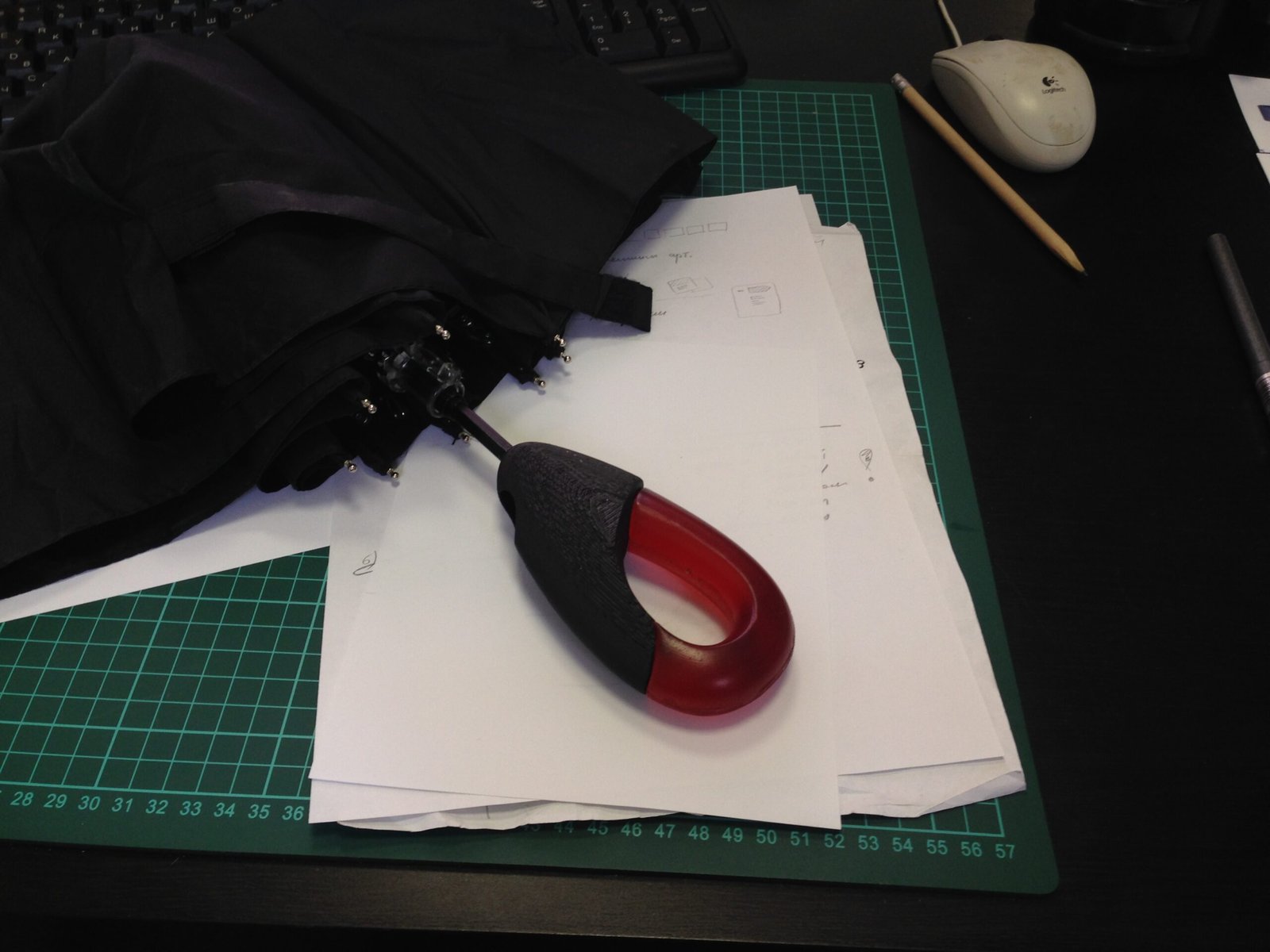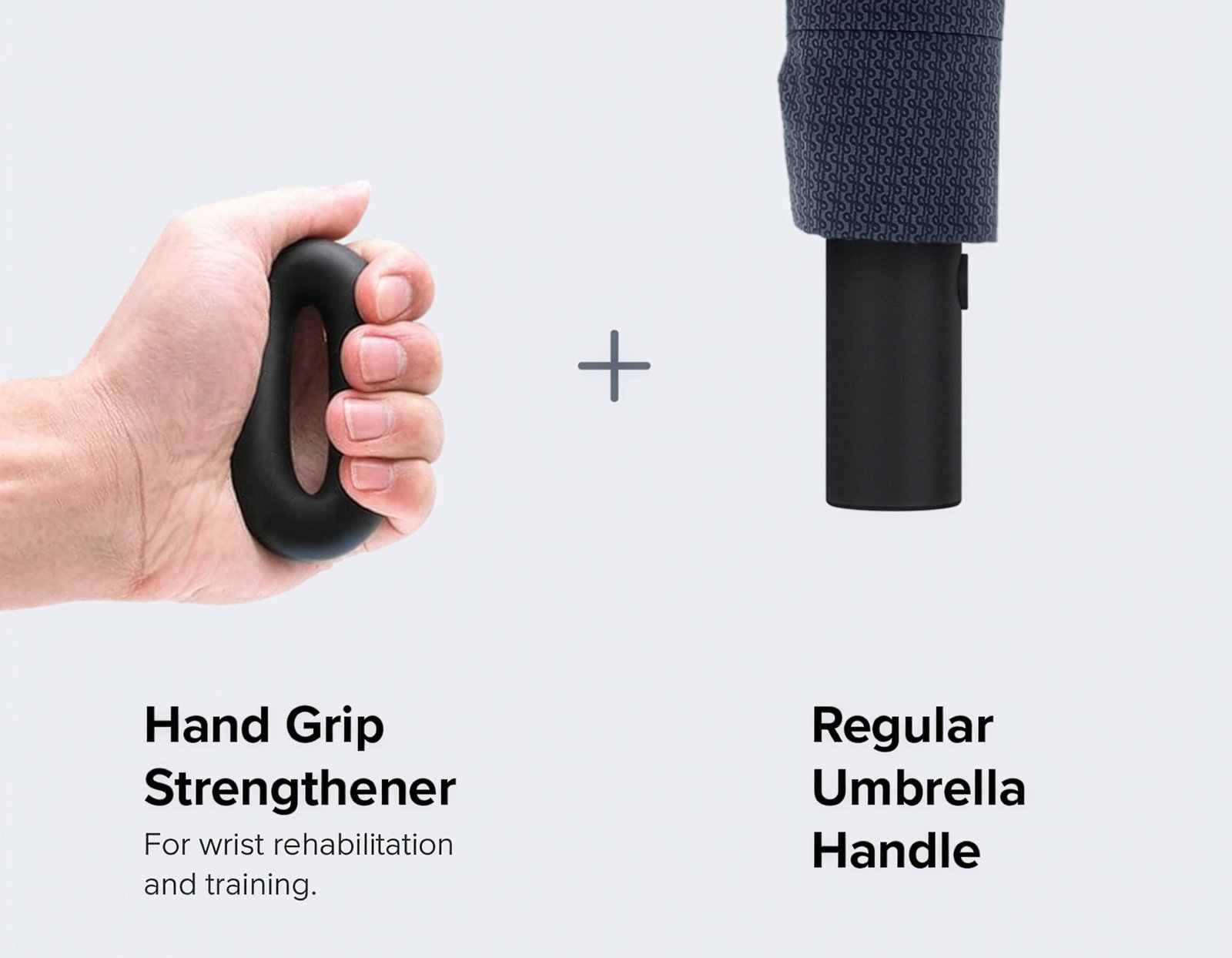 A dual-purpose umbrella handle designed with a flexible elastomer core that turns everyday walking into hand and finger rehabilitation/workout.